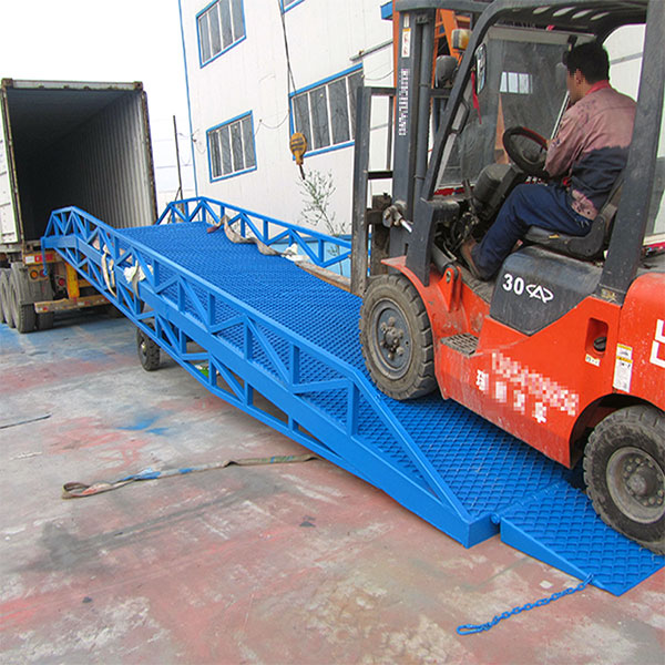 移動(dòng)登車橋是實(shí)現(xiàn)貨物快速裝卸的專用輔助設(shè)備,它的高度調(diào)節(jié)功能使貨車與庫(kù)房的貨臺(tái)之間架起一座橋梁,叉車等搬運(yùn)車輛通過(guò)它能直接駛?cè)胴涇噧?nèi)部進(jìn)行貨物的批量裝卸,僅需單人作業(yè),即可實(shí)現(xiàn)貨物的快速裝卸。